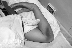 13日,記者在道外區(qū)太平人民醫(yī)院見(jiàn)到了燕燕。在燕燕的乳房上,記者看到多處硬幣大小的外傷,她頭頂部的一縷頭發(fā)已經(jīng)被燒焦。燕燕說(shuō)這都是小峰用蠟燭燙的和燒的。燕燕的右胳膊綁著鋼板,雙肩及鎖骨處都纏著醫(yī)療用背帶,左大腿及臀部一大片淤青,一道道劃傷赫然醒目,左腿膝蓋處有一塊乒乓球大小的部分,肉還翻在外面。燕燕說(shuō)這些都是她跳樓時(shí)摔傷和刮傷的。燕燕不時(shí)地哭鬧,喊著頭疼。在14日對(duì)燕燕進(jìn)行的頭部CT檢查中,證實(shí)燕燕顱內(nèi)出血。