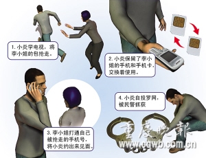 一男孩搶走一女孩手機(jī),還將搶來的手機(jī)卡和自己的換來換去地用。被搶女孩打通自己的電話,自稱朋友約搶匪見面,搶匪信以為真,結(jié)果自投羅網(wǎng)。