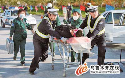 交警和120急救人員展開(kāi)現(xiàn)場(chǎng)急救運(yùn)送“傷者”。