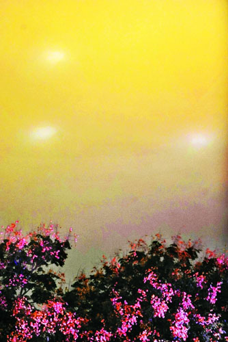 昨晚9時許,霧氣沉沉的鄭州夜空多處出現(xiàn)白色斑塊,市民紛紛猜測是不是不明飛行物“光”臨鄭州。