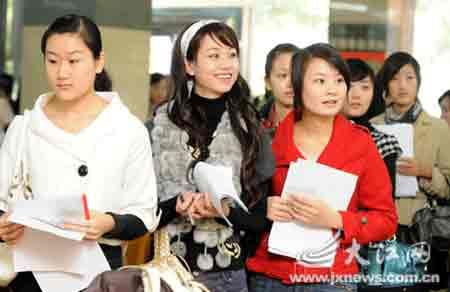 在南昌航空大學就讀的一位大四學生告訴記者,此次連自己共有6人來面試,但目前只有兩人進入復(fù)試,其余4人就是卡在英語關(guān)和反應(yīng)能力的考驗上。記者在現(xiàn)場看到,進入面試的應(yīng)聘美女在填寫個人簡歷時也必須用英文。