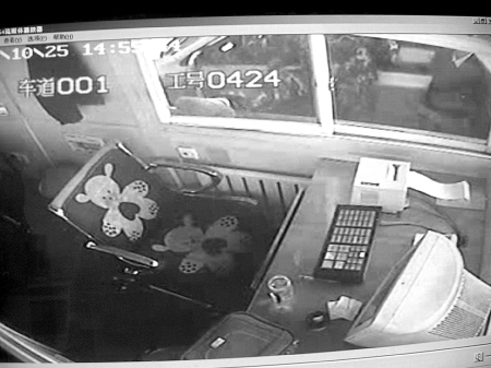 14時(shí)55分,一穿迷彩服的中年男子打開車窗,向收費(fèi)窗口里扔了一個(gè)煙頭。隨后該男子下了車,拳腳相加,敲打踢踏收費(fèi)窗口玻璃。