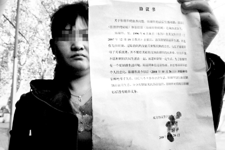因?yàn)檫@份協(xié)議不合法,鄭州市公證處不予公證。為了讓協(xié)議具有效力,劉紅和王麗在簽字上面按上指印。按上指印后,王麗突然咬著嘴唇,淚珠大顆大顆掉了下來。她匆匆在一張協(xié)議上按了指印后,死活也不愿在另外兩張上面按了,并開始大罵她的丈夫王濤。門外圍了一圈鄰居。大家七嘴八舌勸道:“何必這樣呢,兩家人商量個(gè)辦法,一塊來照顧孩子。不管怎樣,要為孩子想想!蓖鯘哑渌送晖馔疲骸皼]事沒事,放心吧,她現(xiàn)在不按,回頭我會(huì)勸她!