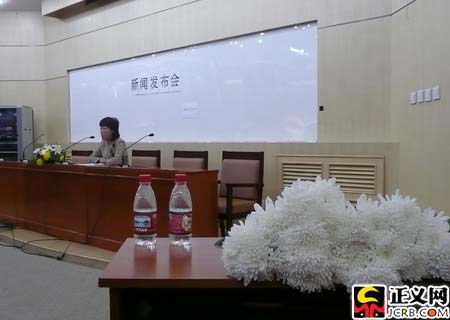 新聞發(fā)布會現(xiàn)場擺放著寄托哀思的白菊花