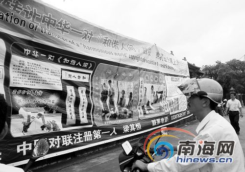 叫賣對聯(lián)版權(quán)的人叫梁其恒,海口市瓊山區(qū)甲子鎮(zhèn)人。梁其恒告訴記者:“近幾年,農(nóng)村的變化很大,農(nóng)民的生活水平也有了很大提高。自從瓊山合并到海口后,海口市委市政府對農(nóng)民的生活很重視,相繼解決了農(nóng)民喝水難、行路難等問題。農(nóng)村合作醫(yī)療以及減免義務(wù)教育階段學(xué)生學(xué)雜費、課本費等政策,使農(nóng)民看病更容易了,醫(yī)藥費也更便宜了,孩子們都上得起學(xué)了。看到這一切,梁其恒對黨和政府充滿了感激之情,開始尋思著利用一種形式把這種感激之情表達(dá)出來。最后,他選擇了創(chuàng)作對聯(lián)。據(jù)梁其恒介紹,他從2003年3月開始構(gòu)思,前后花了兩年多時間,不斷修改創(chuàng)新,終于于2005年12月份完成了對聯(lián)《和諧人間》的創(chuàng)作(上聯(lián):錦繡中華與時俱進(jìn);下聯(lián):濤瀛神州繼往開來;橫聯(lián):和諧人間)!逗椭C人間》創(chuàng)作完成后,梁其恒邀請了海南知名的書法家書寫文字,并自費印刷了幾百份,在親戚朋友間發(fā)放。梁其恒說,親戚和朋友們對他的對聯(lián)都很喜歡,還有許多臨高、瓊海等地的外地人也慕名而來,甚至還有人自愿掏錢購買他的對聯(lián)。
