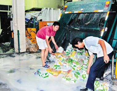 高先生說,國家規(guī)定對9月14日前出場的不合格乳制品進行銷毀處理,但并沒有規(guī)定具體銷毀方法。他們選擇將液態(tài)奶送垃圾站處理,是因為他們認為這是一種比較正規(guī)的銷毀方式。而在小城市,一般只是將成箱液態(tài)奶集中后碾壓,然后掩埋。
