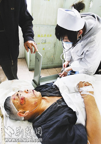 昨日中午,記者在漢川市人民醫(yī)院,見到了顱骨骨折的鄭某(如圖)。據(jù)他的親屬介紹,該村距武荊高速公路約200米。3日晚,他們討說法時,遭施工人員毆打,其中一人顱骨骨折,多人身上有棒傷。