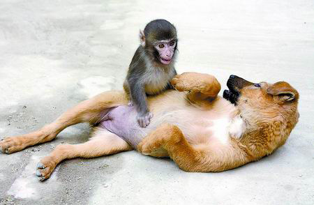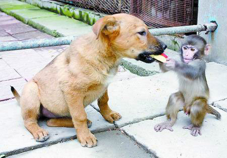 昨天(5日)上午,記者在駐馬店市南海公園動(dòng)物園看到,一只6個(gè)月大的雌性小狗與年齡比自己小一個(gè)月的雄性猴崽愉快地在一起玩耍。