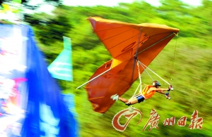 在這次的“鳥(niǎo)人賽”上,以往創(chuàng)造的25米飛行記錄終于被來(lái)自珠海本地的一名飛行愛(ài)好者打破。在昨天的飛行比賽中,珠海當(dāng)?shù)匾患绎w行俱樂(lè)部的會(huì)員李志和駕駛著心愛(ài)的三角翼飛行器——“天翼弄人”在快速奔跑后,從8米高的高臺(tái)上向著前方的水面漂去,在一片掌聲中,李志和以26米的飛行距離創(chuàng)造了新的飛行記錄。