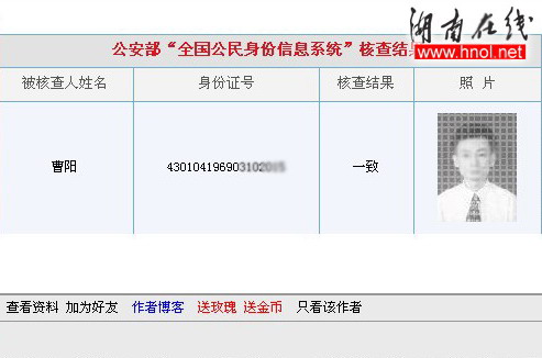不少網(wǎng)友根據(jù)已有信息開展“人肉搜索”,據(jù)網(wǎng)友“追尋者”提供的信息顯示,該男子系岳陽市人大代表,69年出生,名叫曹陽。一名網(wǎng)友更利用公安部新近開通的“全國(guó)公民身份信息系統(tǒng)”將曹姓男子的身份證照片搜索出來并貼到網(wǎng)上。還有山東棗莊的網(wǎng)友提供了嫌疑男子的手機(jī)號(hào)碼及詳細(xì)住址,網(wǎng)友半信半疑,有網(wǎng)友更是試圖撥打號(hào)碼,但無法接通。