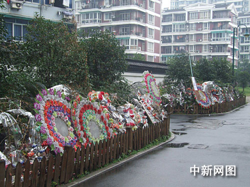 11月5日,記者看到,杭州新星實業(yè)有限公司前面近300平方米的空地仍舊被圍墻圍著,圍墻外面則擺滿了花圈,而這道圍墻,就是小區(qū)居民與陳連榮之間的導火索。