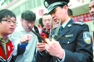 即日起至12月20日,警方和(北京)市教委聯(lián)合在本市大、中、小學校收繳管制刀具,并清理校園周邊販賣管制刀具的攤販。前天,西城警方率先走進北京實用美術(shù)學校,通過真實的案例和實物,向?qū)W生宣傳什么是管制刀具,管制刀具有什么危害,呼吁學生配合此次收繳行動。