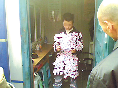 昨日下午,記者聯(lián)系上發(fā)帖者“十五阿哥”。他回憶說,拍攝照片的時間是11月7日上午10點半左右。當(dāng)他和同事經(jīng)過海關(guān)車站對面的市政監(jiān)察亭時,發(fā)現(xiàn)門口圍滿了人。他湊進去一看才發(fā)現(xiàn),一個“卡娃”被城管懲罰全身貼滿紙膠貼示眾!疤珎⒆拥淖宰鹦牧恕!薄笆灏⒏纭狈Q,當(dāng)時男孩一直低垂著頭不敢面對人群,而亭內(nèi)幾個執(zhí)法隊員卻不聞不問,各自做著自己的事情。