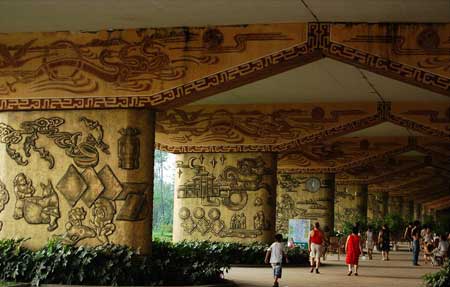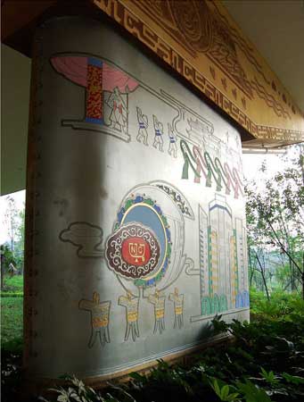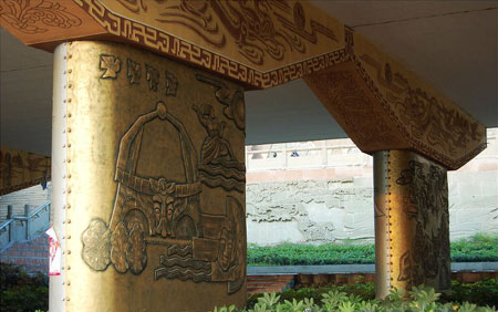 據(jù)有知情網(wǎng)友透露,這座“史上最牛的橋墩”來自四川德陽市鼓樓下的成綿高速高架橋橋墩。橫亙在鼓樓與廣場之間的高速公路橋墩,成了設(shè)計者發(fā)揮想象的地方。設(shè)計者將28個橋墩進行裝飾改造,以仿古浮雕銅板扣畫和仿敲銀浮雕扣版畫及大型仿烙鐵裝飾畫體現(xiàn)德陽6縣(市、區(qū))歷史文化、風(fēng)景名勝、人文景觀及重裝基地風(fēng)采。整個壁畫長廊立體感極強,既抽象又寫實,色彩明朗,極具現(xiàn)代藝術(shù)風(fēng)格。彩虹橋、石刻、白馬關(guān)、龐統(tǒng)墓、倉山大樂、黃繼光紀念館、三星堆、年畫館、劍南春……德陽的標志一一在此得以展現(xiàn),每個篇章把歷史文化、風(fēng)景名勝、人文景觀融為一體,形成一個完整的壁畫群落,壁畫面積達2309平方米,是整個德陽地區(qū)景點的微縮!笆飞献钆5臉蚨铡庇2007年初推出,并受到當(dāng)?shù)仡I(lǐng)導(dǎo)的表揚。