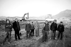昨日下午,40余名松樹峪村村民守在村東口的修路工地里,阻止推土機(jī)掘土施工,數(shù)輛施工機(jī)器停在工地由工人看守。被推平的土地寬20余米,兩側(cè)的莊稼地里還留著連片的秸稈。