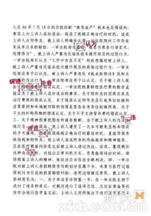 記者在判決書掃描件中的確發(fā)現(xiàn)不少筆誤,比如把“導(dǎo)致”寫成“導(dǎo)治”、“人工流產(chǎn)”寫成“工人流產(chǎn)”、“附件炎”寫成“附件驗(yàn)”和“附件鑒”、“被上訴人”寫成“被上訴們”、“認(rèn)為”寫成“真?zhèn)巍保熬懿椤睂懗伞皳?jù)查”、“整理”寫成“整體”、“人流史”寫成“人流使”等。