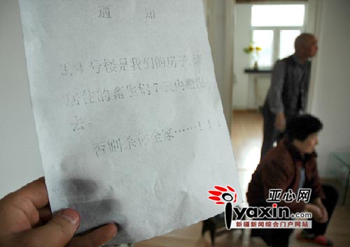 星云房產公司的相關負責人告訴亞心網(wǎng)記者,恐嚇通知并不是他們張貼出去的,烏市株洲路新鑫花園小區(qū)三四號樓的產權屬于他們,手中也有《商品房預售許可證》和合法的手續(xù),住戶應該盡早搬離。