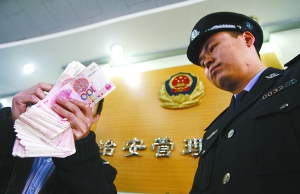 昨日,北京治安管理總隊,獲得2萬元獎勵的非法煙花舉報人李先生清點自己的獎金。 記者 張濤 攝
