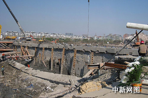 今天下午,記者看到有兩名三十出頭的年輕人手捧白色菊花來到地鐵坍塌現(xiàn)場,表情十分沉重。兩人走到基坑南側,在一塊空地上放下菊花,隨后環(huán)視周圍,流露出幾分焦慮。雪白的菊花因幾許微風拂過而輕輕顫抖,似乎也在訴說著遇難者的不幸。