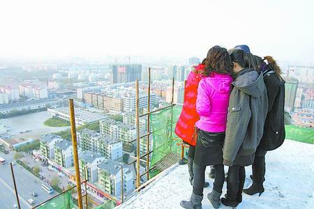 昨日下午3時(shí),記者趕到航海路與未來路交叉口附近的中鼎翡翠2期公園壹號樓盤。記者上到25層樓頂,看到6名女子正站在西側(cè)沒有任何防護(hù)設(shè)施的邊緣。聞?dòng)嵹s到的管城消防大隊(duì)一中隊(duì)消防員和航海路派出所民警已經(jīng)趕到現(xiàn)場,對欲跳樓的6名女子進(jìn)行勸說。由于風(fēng)大很冷,記者注意到這些售樓小姐相互之間聚得很緊。