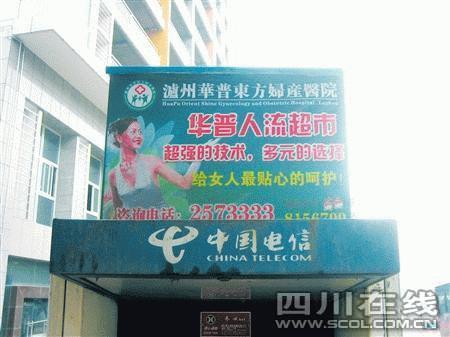 本學(xué)期開學(xué)以來,一位瀘州十五中女生家長多次反映學(xué)校附近人行道電話亭上的華普東方醫(yī)院廣告涉嫌違規(guī)!疤幌裨捔,他們居然打出‘ 人流超市’的宣傳。是不是說‘人流’就像進商場買東西一樣簡單嘛?”該家長認(rèn)為,人工流產(chǎn)是一件對女性身體傷害極大的事情,年輕女性應(yīng)該盡量避免。醫(yī)院如此打出人流廣告,是暗示人流像在超市購買商品一樣簡單,對女性尤其是少女健康不利。“他們還把廣告打在學(xué)校附近,對正處于成長發(fā)育期的孩子非常不利。我真擔(dān)心女兒受到影響!”接到家長反映后,記者在城區(qū)連江路十五中附近和前進中路一帶發(fā)現(xiàn)了這些廣告。廣告都發(fā)布在人行道電話亭頂部,約兩平方米大小,除了宣傳醫(yī)院名稱、超強技術(shù)等內(nèi)容外,“華普人流超市”作為廣告主體內(nèi)容顯得格外顯眼。