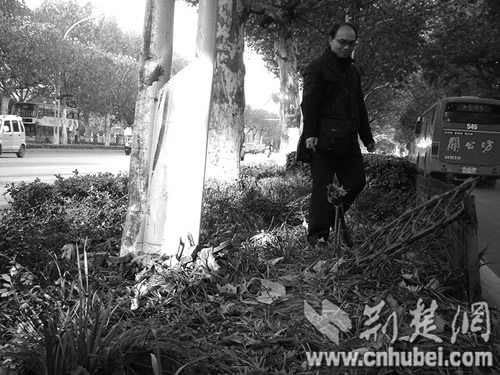 記者在現(xiàn)場看到,路邊的法桐樹被撞掉一層樹皮,綠化帶的鐵護欄被撞斷,路燈桿被撞歪。