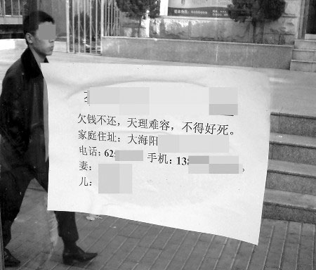 由于債務(wù)糾紛,煙臺一市民慘遭“大字報(bào)”惡意侮辱,其家庭住址、電話號碼,甚至妻兒姓名均被人張貼公布,并被詛咒“不得好死”。對于這種極端的做法,法律界人士認(rèn)為太荒唐。 12月1日13點(diǎn)50分,記者在煙臺市區(qū)大海陽路仁愛醫(yī)院公交站點(diǎn)看到,眾多等車的市民湊在站牌下,圍觀一張貼在站點(diǎn)玻璃上海報(bào)一樣的紙張。記者看到,這張紙居然是一份“大字報(bào)”,上面寫著“×××欠債不還,天理難容,不得好死”等內(nèi)容,并將“欠債者”的家庭住址、電話號碼、手機(jī)號碼以及妻子、兒子的姓名全部公布出來。在這份“大字報(bào)”旁邊,還有另一張內(nèi)容一樣的,只不過已被人撕去大半。候車市民見到這樣一張言辭惡劣的“大字報(bào)”,無不嘆息搖頭。