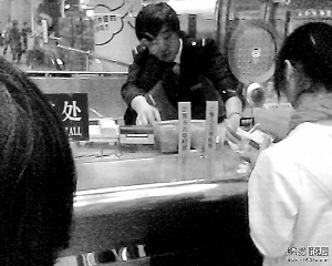 在該帖子中,網(wǎng)友monitorhand貼出了他所拍的照片,一共5張。從照片中看到,在售票窗口內(nèi),一名身穿地鐵工作制服男職工正在為市民辦理業(yè)務(wù)。記者看到,該名員工的右腳擺得很高,右手手臂就墊在右腳的膝蓋上。另外,從照片中可以看到,該名男職工至少在為3名乘客服務(wù)的過程中保持這種姿勢(shì)。