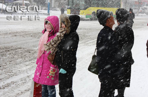 行人冒著頂著風雪等車