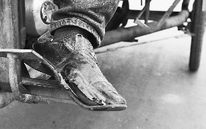 行駛14天后,摩的司機(jī)的皮鞋已磨破。