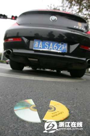 那么后車牌上為什么有光盤擋著?男子嘴里嘟囔了一句,是小孩子干的。說著,繞到車后,想去揭粘在牌照上的光盤。光盤粘得太牢了,一掰,破成了兩半。
