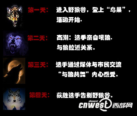據(jù)西安秦嶺野生動(dòng)物園負(fù)責(zé)人任飛翔介紹,該園將在陜西省內(nèi)招募三名年齡在二十二歲至四十五歲之間,寫作能力強(qiáng),善于使用照相機(jī)、攝像機(jī),膽量過人且有一定戶外生存經(jīng)驗(yàn)的男士,于十二月八日進(jìn)入野狼谷指定活動(dòng)區(qū)域——酷似“鳥巢”的茅草棚居住三天。 期間吃、喝、拉、撒、睡均在“鳥巢”里度過。要求他們記錄下野狼的活動(dòng)規(guī)律、生活習(xí)性、等級(jí)序列、幫派體系,以及狼與狼之間的情愛恩怨,狼與人之間的關(guān)系和挑戰(zhàn)者的感受。按要求完成挑戰(zhàn)任務(wù)者,將獲得五千元人民幣獎(jiǎng)金,并頒發(fā)榮譽(yù)證書。