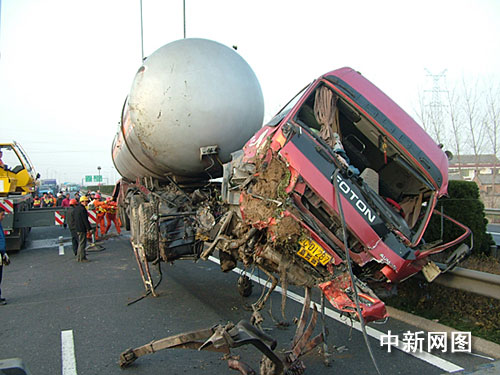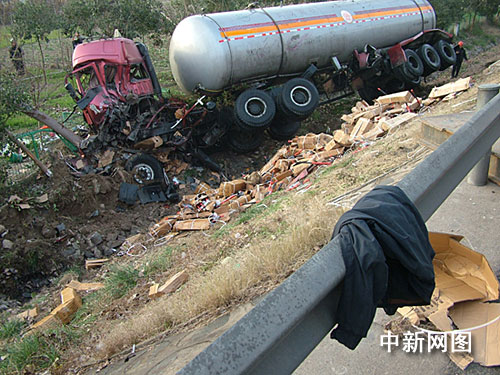 中新網(wǎng)淮安十二月九日電(朱曉穎 閻大偉)七日清晨五時(shí)三十分許,京滬高速江蘇淮安楚州段一輛載有一千六百四十箱、萬(wàn)余把斧頭的大貨車(chē)與一輛裝有二十多噸液化氣的槽罐車(chē)相撞,由于巨大撞擊力,兩車(chē)均沖出護(hù)欄、側(cè)翻在路邊的溝中,所幸未造成人員傷亡。
