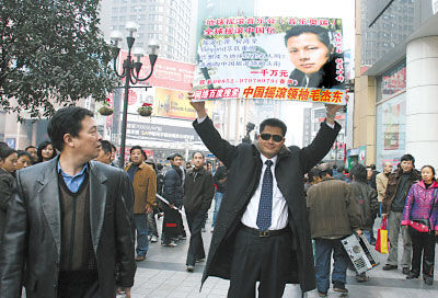 昨天下午4時許,記者在解放碑步行街看到,該男子舉著一塊長1米,寬0.5米的廣告牌在游走,衣著及外形模仿周潤發(fā)在電影《英雄本色》中扮演的“小馬哥”。牌子上大致內(nèi)容是:“中國搖滾領(lǐng)袖舉辦搖滾音樂會,如果你想成名,請收購中國搖滾領(lǐng)袖頭銜,一千萬”。他以這身行頭出現(xiàn)引來上百人圍觀,甚至有市民以為在拍電影,上前與他握手!八褪巧洗握髑f富婆的那個人!辈糠质忻裾J(rèn)出了這名男子正是幾個月前曾在解放碑征千萬富婆結(jié)婚的“征婚狂人”廣西人毛杰東。毛先生表示,想憑自己酷似發(fā)哥的外形,通過征婚獲得資金發(fā)展搖滾事業(yè),雖沒成功,但他熱愛搖滾的熱情還未減退,這次想在解放碑拍賣自己“搖滾領(lǐng)袖”的頭銜,也就是拍賣自己。如果有人愿意拿出1000萬或500萬來投資,他就可以組辦搖滾演唱會,并將繼續(xù)曾經(jīng)的征婚路線,到各大城市宣傳自己,下一站將到成都。下午6時許,經(jīng)保安人員多次勸解、警告,毛杰東才離開步行街。