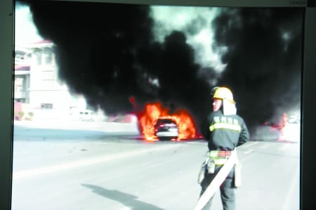 由于擔(dān)心車內(nèi)還有人被困,侯隊(duì)長(zhǎng)立刻派3名隊(duì)員和一輛高噴車從不同角度滅火。5分鐘后火勢(shì)基本上被控制,消防隊(duì)員查看后發(fā)現(xiàn)車內(nèi)并無(wú)被困人員!靶目偹惴呕囟亲永锶チ。”侯隊(duì)長(zhǎng)說(shuō),七八分鐘后大火就被全部撲滅。