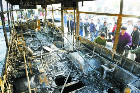下午3時(shí)許,出事的白色奇瑞已被拖離現(xiàn)場(chǎng),被燒壞的公交車趴在地上,外胎已被燒化粘在地上,車內(nèi)的坐椅、玻璃也在大火中全部燒化,整個(gè)車體只剩下一個(gè)框架。“乖乖,鋼板都燒化了!币幻麌^者舉著兒子使勁往前湊。