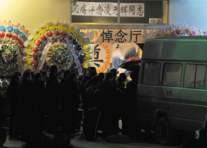 昨晚,昭通市昭陽區(qū)殯儀館燈火通明,擺滿了祭奠凌光輝的花圈,多數(shù)為政府機關(guān)所祭,市、縣兩級相關(guān)領(lǐng)導干部及凌光輝的親戚朋友在等待著凌光輝的靈車。直到晚8點,靈車才開進殯儀館,警車開道,一輛急救專用車載著凌光輝的靈柩進入殯儀館,15分鐘后,把靈柩安放進靈堂。