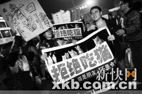 在廣場上,一見“聞貓即興”等人出來了,其他人都著急地圍上去詢問。盡管結(jié)果不是太讓人滿意,但大伙還是決定在廣場上舉行一次小型的抗議活動(dòng)。100多人圍在一起,高舉著“請發(fā)揚(yáng)人道主義,放過它們”、“請口下留情”、“拒吃貓肉”等紙牌,喊著口號(hào)。并有細(xì)心的網(wǎng)友拿著印制好的傳單,向候車的乘客宣傳“不吃貓肉”。對此,路人大都報(bào)以一笑。