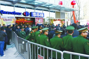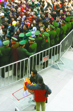 “新店開張,油、米、面、肉低價(jià)促銷,還發(fā)券,能不吸引人嗎?”李先生說,昨日上午9時(shí)許,他原準(zhǔn)備趕在超市剛開門就進(jìn)去轉(zhuǎn)轉(zhuǎn)。但一到萬達(dá)廣場,只見家樂福門口聚集著大量顧客,數(shù)百人的隊(duì)伍早就排至數(shù)十米外,并還在不斷膨脹。為維持秩序,工作人員在隊(duì)伍兩側(cè)安置了簡易護(hù)欄,同時(shí),數(shù)十名武警一字站開,引導(dǎo)眾人進(jìn)入超市。