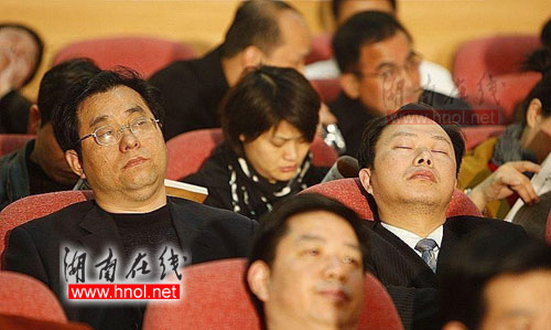 臺(tái)上報(bào)告不斷,臺(tái)下酣睡一片。有人捧起文件作掩護(hù),有人手托下巴在“思考”,有人則肆無忌憚地仰頭大睡……21日,網(wǎng)友“cocohaha”在華聲論壇發(fā)圖爆料,稱這一壯觀場景是出自衡陽市紀(jì)念改革開放30周年大會(huì)。