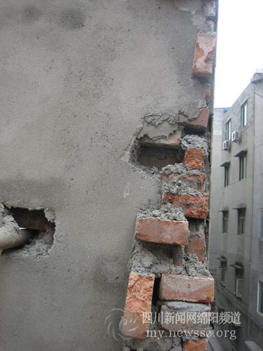 記者在禹世均的改建房屋處看到,房屋墻體凹凸不平,多處墻面脫落,水泥填補處用手便可摳出水泥塊,半成品的墻體露出砌得歪歪扭扭的磚塊。