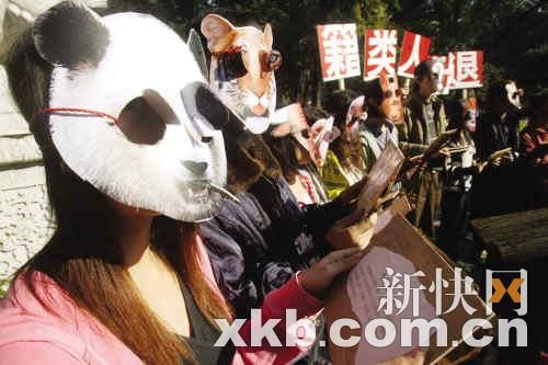 多名自發(fā)組織的志愿者頭戴面具,用行為藝術(shù)呼吁保護(hù)動(dòng)物。許都/攝