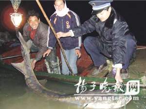 “開(kāi)始不知道是什么東西,只覺(jué)得它力氣特別大,把水撲騰得嘩嘩直響!”捕獲中華鱘的邗江區(qū)李典鎮(zhèn)沿江村漁民胡長(zhǎng)發(fā)告訴記者,當(dāng)晚,他和兒子一起駕小掛槳船在頭橋長(zhǎng)江夾江深水區(qū)用流刺網(wǎng)捕魚(yú),開(kāi)始收第一網(wǎng)時(shí),感到很重,費(fèi)了九牛二虎之力,將魚(yú)拖出水之后,憑經(jīng)驗(yàn)看,應(yīng)該是中華鱘。由于魚(yú)太大,結(jié)實(shí)的流刺網(wǎng)已經(jīng)有好幾處被它“拱”破了。“這可是國(guó)家保護(hù)魚(yú)類,快打電話報(bào)告!”老胡當(dāng)即通過(guò)村干部通知漁政部門(mén)。隨后,他與兒子及另外一個(gè)漁民用粗繩子牽住中華鱘,3人一起用力往岸邊靠,幾分鐘的水路,足足花了40多分鐘。
