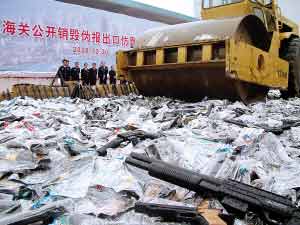 據(jù)了解,這批仿真槍是廣東省海關(guān)系統(tǒng)近年來(lái)查獲的最大一宗走私仿真槍案。2006年4月5日,深圳市祥鵬達(dá)貿(mào)易有限公司以一般貿(mào)易方式向汕頭海關(guān)申報(bào)出口塑料玩具469箱,共62468個(gè),凈重11032公斤。經(jīng)海關(guān)查驗(yàn)確認(rèn),其中的310箱申報(bào)為塑料玩具(軟彈槍)的貨物實(shí)際為仿真槍43款共42762支,申報(bào)貨物與實(shí)際不符。經(jīng)鑒定,該批貨物分別與美國(guó)產(chǎn)“航空曲尺”、“M9”、“格魯GP-100左輪”等軍用手槍近似;與美國(guó)產(chǎn)“MP5K-PDW”、匈牙利產(chǎn)“NGM”等沖鋒槍、步槍近似,均為仿真槍。(本報(bào)記者 楊媛 通訊員 岱芬 純潔 曉潔 攝影報(bào)道)