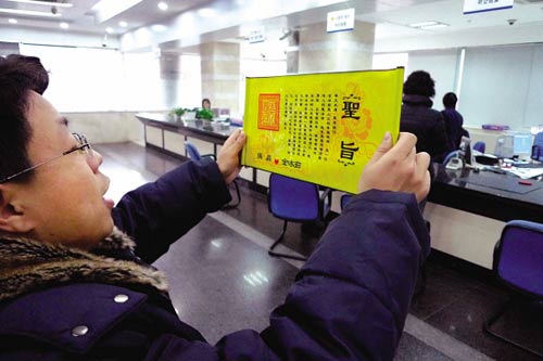 “奉天承運(yùn),皇帝詔曰……張磊要對(duì)她比自己還要好……”昨天上午,在杭州體育場(chǎng)路某銀行,這一電視劇里的場(chǎng)景成了現(xiàn)實(shí):小伙子張磊大約清宮戲看多了,手持“圣旨”,滿腔熱情地宣讀了自己對(duì)女孩小如(化名)的愛意。