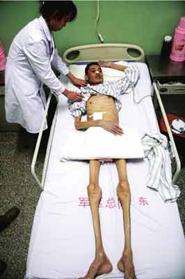 昨天下午,記者在軍區(qū)總院普外科病房見到了耿松峰,他雙臂向上彎曲放在枕邊,右側(cè)肩部正進(jìn)行靜脈營(yíng)養(yǎng)注射,一袋普通塑料袋大小的乳白色液體已經(jīng)見底。他說話吃力,但仍然翕動(dòng)著嘴唇說:“伯伯(指普外科主任)是個(gè)好人!鄙砀1.72米、體重曾60公斤的他現(xiàn)在只有33公斤,大腿也只有成年男性手腕粗。他母親用極不流利的普通話說,因?yàn)閮鹤拥牟。呀?jīng)家徒四壁,親戚、高利貸,各種借錢的方法都想到了,已經(jīng)花了20多萬,可還是不夠,兒媳也因此要離婚。“現(xiàn)在已經(jīng)欠醫(yī)院5萬塊錢了,可我也不能看著兒子死啊”。