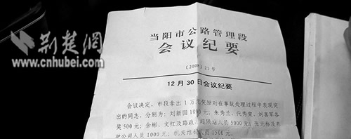 遺體火化當(dāng)日,當(dāng)陽市公路段召開月度工作會(huì),以紅頭文件印發(fā)的《會(huì)議紀(jì)要》決定:拿出一萬元獎(jiǎng)勵(lì)在事故處理過程中“表現(xiàn)突出”的同志,分別為:劉某1000元;朱某、代某、劉某各500元;余某、文某及路政、超限站人員5000元;張某及養(yǎng)護(hù)公司人員1000元;機(jī)關(guān)維穩(wěn)人員1500元。