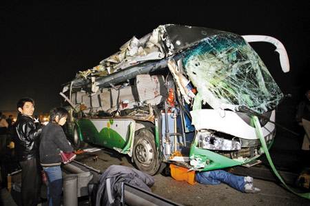 晚上10時許記者趕到現(xiàn)場時,見到一輛車號為贛A16230的大客車?吭诟咚俟仿嚨郎,車身右側(cè)殘破不堪———車門被擠扁,車輪以上的車身外殼已被完全刮掉,右側(cè)前六排座椅皆扭曲變形,上面沾滿血跡。地面上有多處大攤血跡,散落的乘客物品隨處可見。