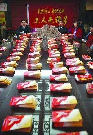 將近三百萬元現(xiàn)金堆在桌子上,看起來有點“夸張”,但它們在即將要送的紅包中,只占現(xiàn)金量的十分之一左右!這次去災(zāi)區(qū),陳光標與63位企業(yè)家捐贈與籌集的現(xiàn)金總額約3000萬元,另外還有大米、豬肉、食用油、羽絨服、毛衣等物資,價值3000多萬元。其中,陳光標的黃埔再生資源利用有限公司捐贈現(xiàn)金300萬元。
