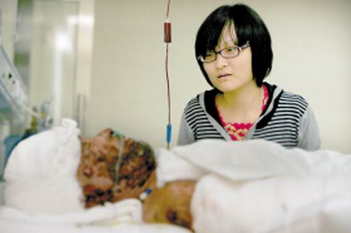 前幾天,在南京打工的父親重度燒傷,南京醫(yī)院給她打來電話,說她父親病危。她以為是騷擾電話,晚三天才趕到南京,從幾千里外,將已燒得不成人樣的父親運(yùn)回故鄉(xiāng),送到吉林省武警總隊醫(yī)院。如今,為了給父親籌集醫(yī)藥費(fèi),20歲的她又踏上打工路。